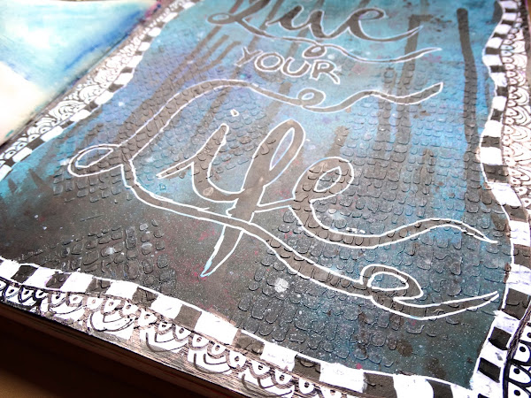 También usé gel medium mate y un stencil para darle textura y un boli de gell blanco para hacer los detalles.