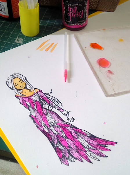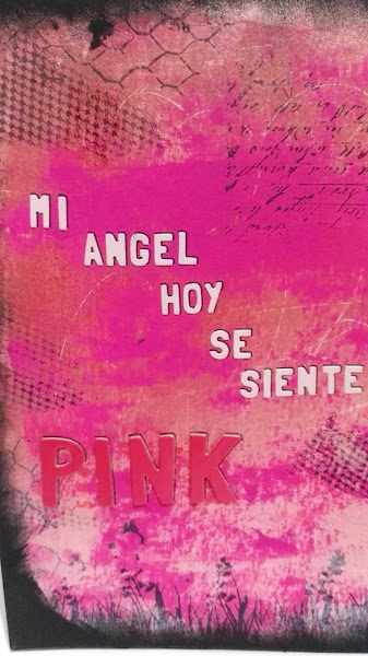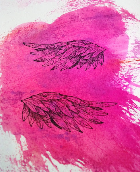 pero mi niña resulta que es un ángel....y tambien tenía que pintar las alas....y como?... pues aprovechando que no se tira nada..... con las gotas que me quedaron en el metacrilato después de pintar el sello, lo estampé en un trozo de cartulina y lo esparcí dejando una especie de fondo, con algo de mezcla