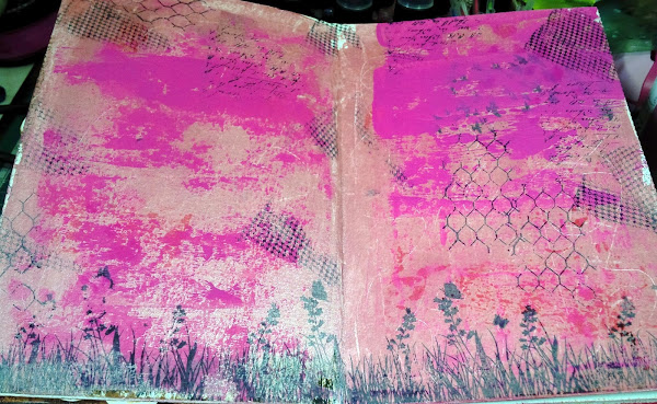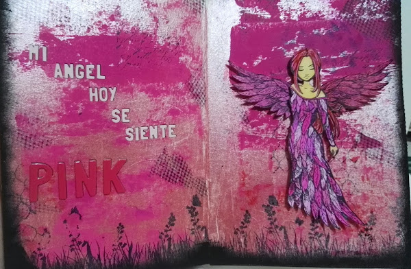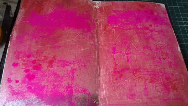 Luego eché mano de mi única dylussion paint, que casualmente y para mi suerte era fucsia, bien! y la apliqué con rodillo por toda la página.... (eso fue porque vi el rodillo y me dije, lo uso si o si)