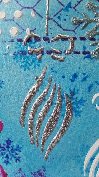 Para los elementos principales, he usado un stencil de bola de arbol con pasta de relieve y he utilizado la técnica de embossing caliente con la pasta, que tenía ganas ya de probar, una en color lila/rosado y la otra en plata....la tercera la he dejado simplemente con la pasta de textura tal cual.