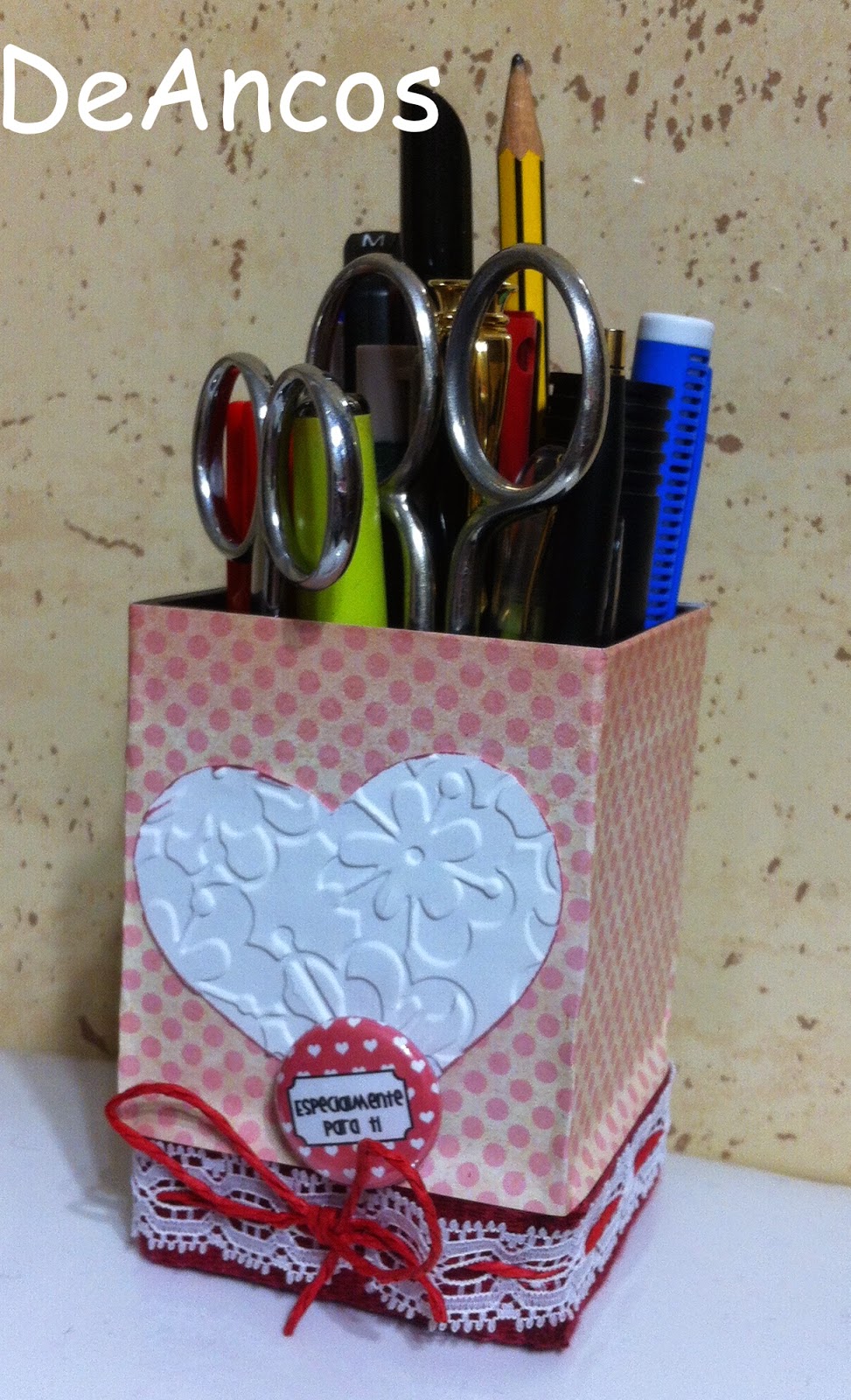 Esta vez me he decantado por un reciclaje. Un portalápices, muy antiguo y muy feo en negro y con propaganda, que había por casa, lo he transformado en esto