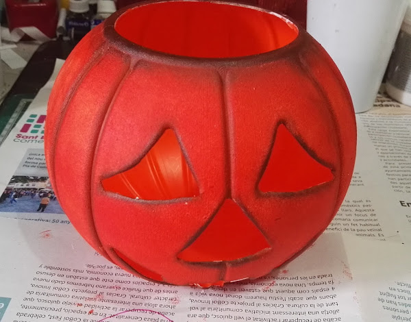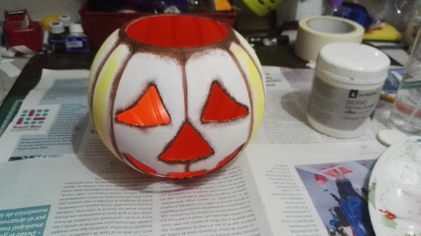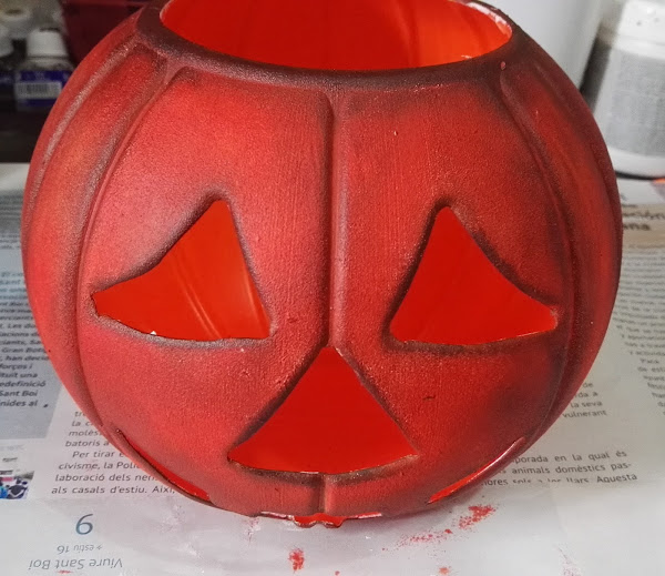 como véis, es una calabaza de plástico comprada en un bazar´, y claro, la verdad es que bonita bonita y a juego con los papeles, no va....así que me tocó ponerme manos a la obra e intentar quitarle ese aspecto de plástico barato, para ello eché mano de las pinturas acrílicas y empecé a darle capas ejjejejej