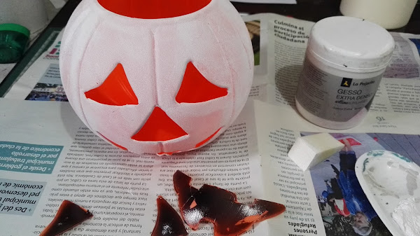 Ahora venía el trabajito entretenido, utilicé un papel crepé naranja para tapar los huecos de la calabaza, y empezar a recortar todos los elementos que quería incorporarle
