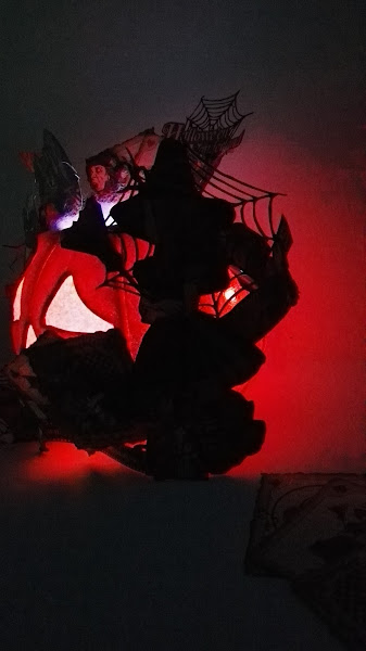 y despues de vueltas y mas vueltas, y unos cuantos elementos mas, como por ejemplo, algodón de ese que venden para simular las telas de araña y troquelados de tela de araña en cartulina negra que le pedí (con todo mi morro y la confianza que da asco) a mi amiga Anna, me dispuse a pegar todo este batiburrillo de cosas ajejejejeje