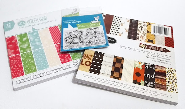 Estos dos staks de papeles, uno de navidad , ideal para hacer tarjetas de la colección Lets bokeh in the snow de Lawn Fanw, otro stack de otoño de la colección Warm & Cozy de Jen Hadfield y un sellito monisimo de Lawn Fanw.