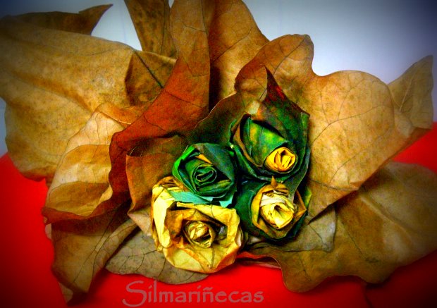 Uno de sus trabajos que me encantó es este precioso ramo de rosas hecho con hojas de árboles, ideal para hacer ahora en otoño.