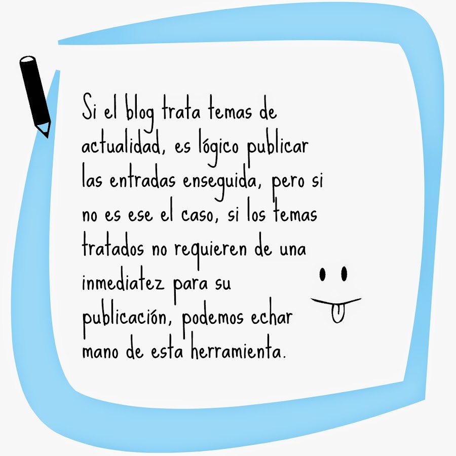 no todos los dias una está inspirada o tiene tiempo para escribir algo, sin embargo otros dias parece que me dan cuerda y empiezo a escribir una entrada tras otra a mi personalmente me gusta que mis artículos salgan por las mañanas, bien prontito, lo que pasa es que a esas horas no estoy delante del ordenador y no puedo publicarlas y esta opcion es de lujo.