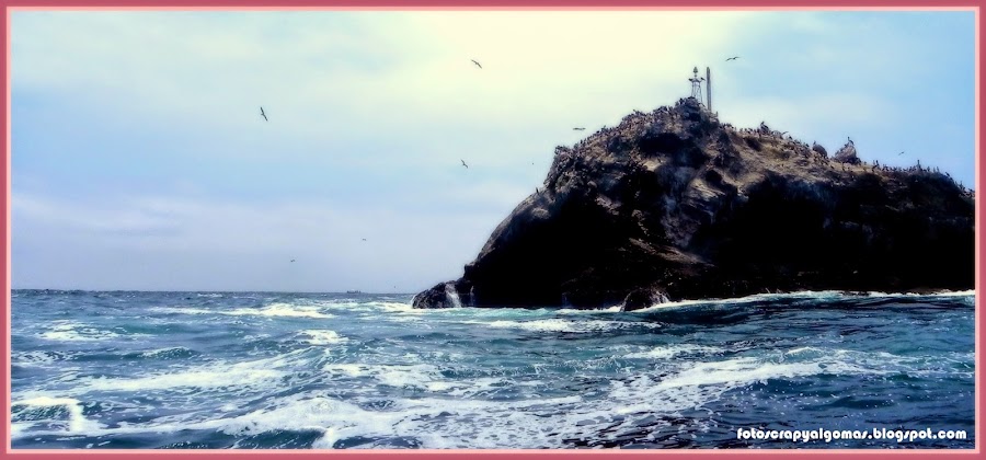 Islote de piedra, donde se puede apreciar muchas aves, el mar al romper en las piedras hace muchas olas.