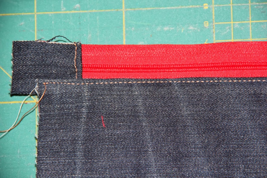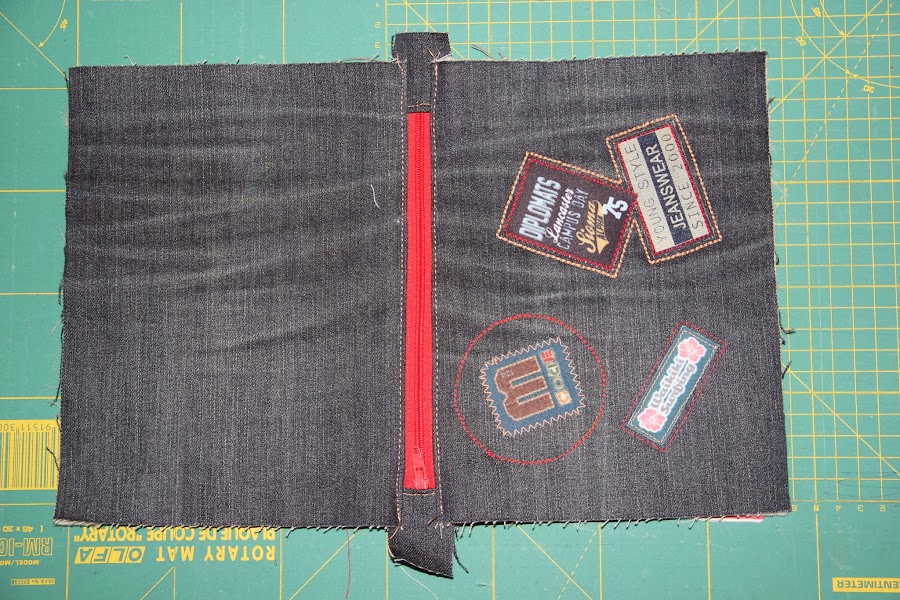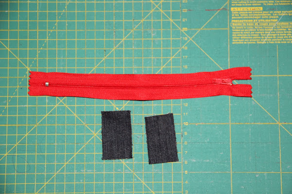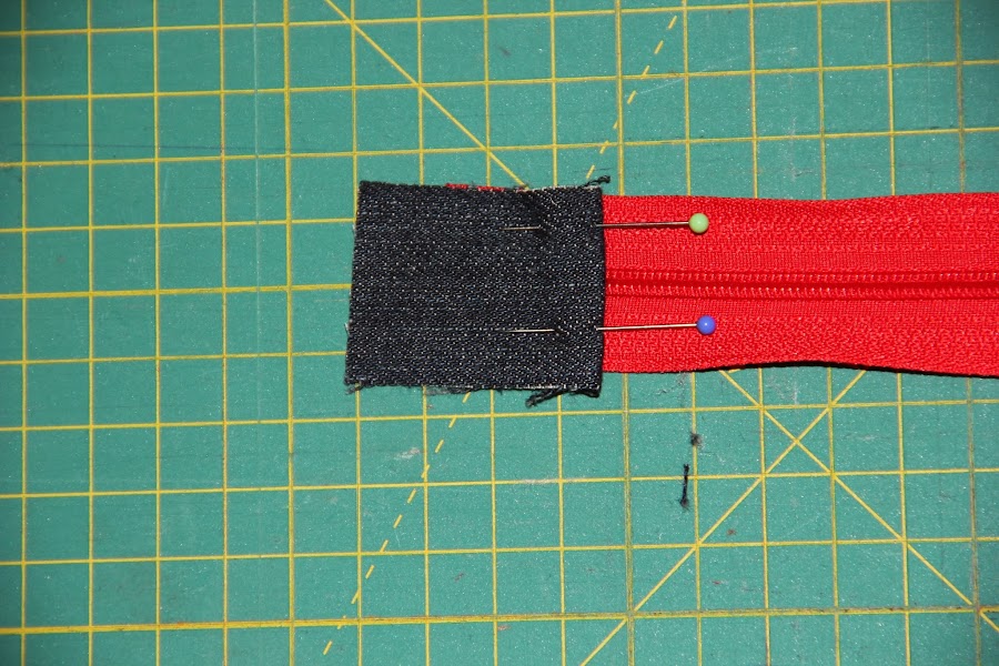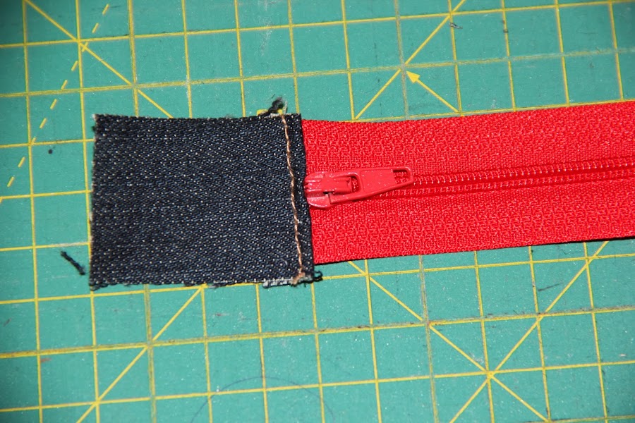 To place the zipper, fold one of the ends of the small pieces of the jean fabric, and sew to the side of the zipper, as shown on the images.