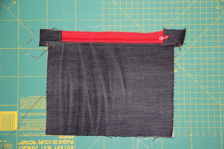 Ponemos uno de los rectángulo de tela vaquera sobre la cremallera