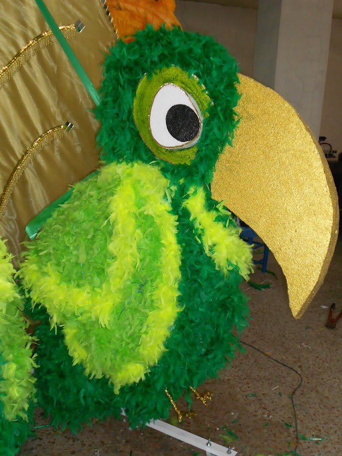 Estos pájaros forman parte de la zona de detrás del traje que lleva la musa de la comparsa y que este año han inspirado en el Amazonas por eso querían hacer estos tucanes. En las fotos no se aprecian los detalles porque las hice cuando estaban desmontando todo para trasladarlo al desfile y como estaba terminando los pájaros mientras, no pude hacer fotos a todo el conjunto.