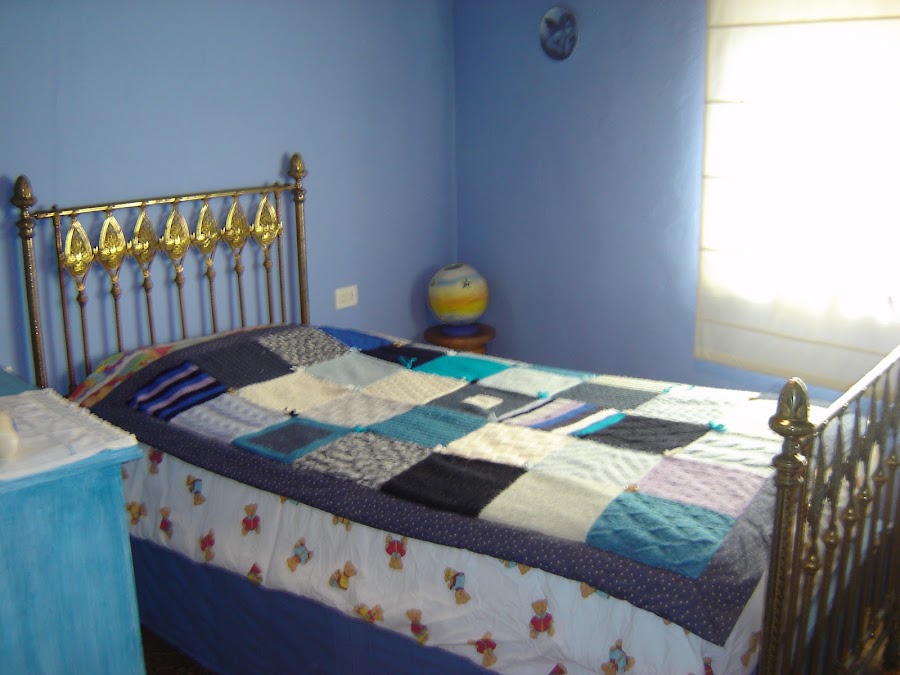 Quería aprender distintos tipos de punto de media, así que me decidí por una manta hecha con cuadros de distintos tipos de punto. Después los engarcé entre ellos. Una vez terminado, hice lo mismo que si se tratara de una manta de patchwork, le puse la guata y como no se puede acolchar, sujeté las tres capas cosiendo grandes botones o con lazos de la misma lana.