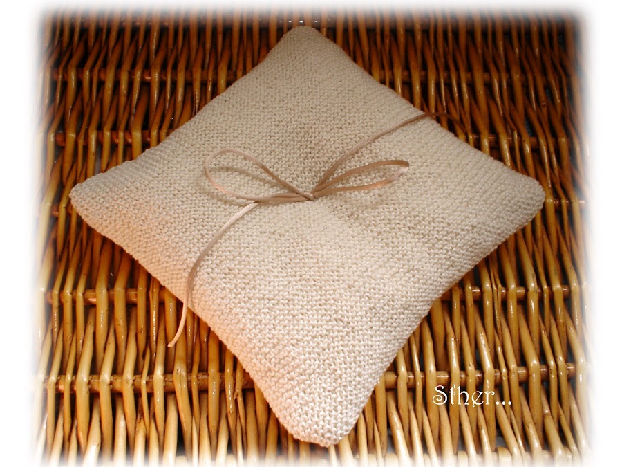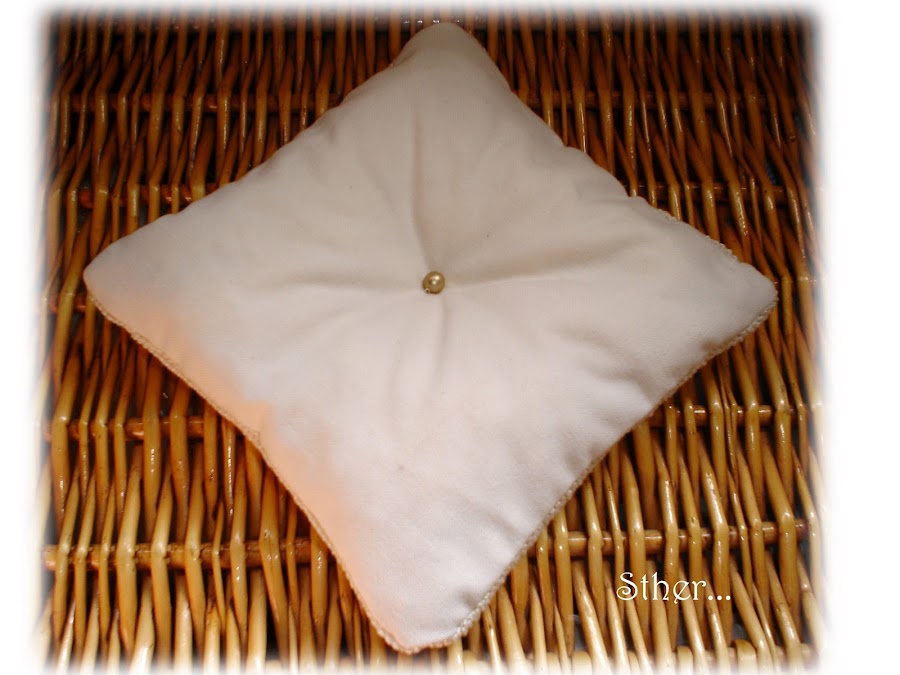 La tela en sí del cojín es de algodón , color natural o crudo, y le he puesto cola de ratón para atar las alianzas al cojín.