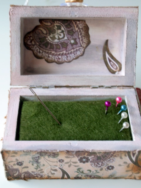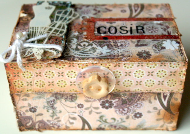 tenía una cajita de esas de madera, sin pintar ni nada, típicas de los chinos...estaba un poco harta de verla rondar por ahi, y tirarla no se me ocurriría en la vida!!! ajaja así que ayer la pillé por banda y me puse a pensar qué uso le podía dar, porque es chiquitina pero susceptible de ser tuneada...bueno pues,de momento, la empece a decorar con mis papeles de 6x6 de basic grey "capella" que mira que me gustan!!!! y pensar en para qué la iba a utilizar mientras pegaba, entintaba y decoraba...al final se me encendió la lucecita y pensé que con una esponjita forrada de tela,justo en el hueco de la caja, podía servir como un alfiletero. Así que como no tenía ninguna tela que me gustara, cogí un trocito de fieltro fino y eso hice...el resultado me gusta y el uso, pues está genial, porque ahora ya no pierdo las agujas seguro!!!! Es cuca verdad???!!!! ajajaja