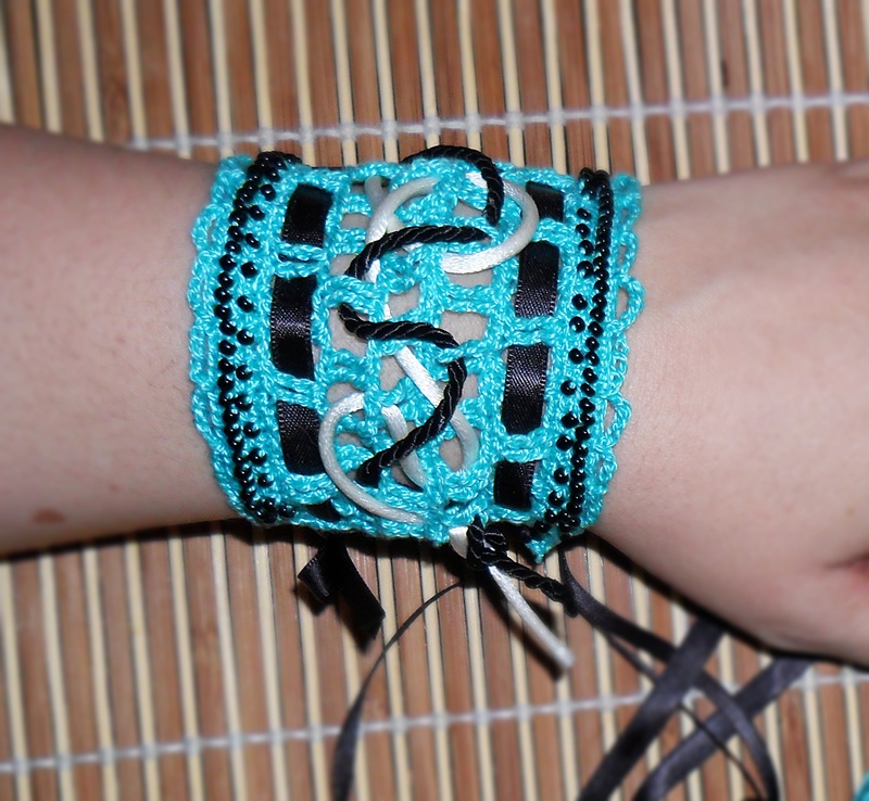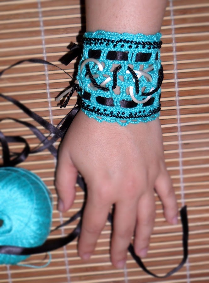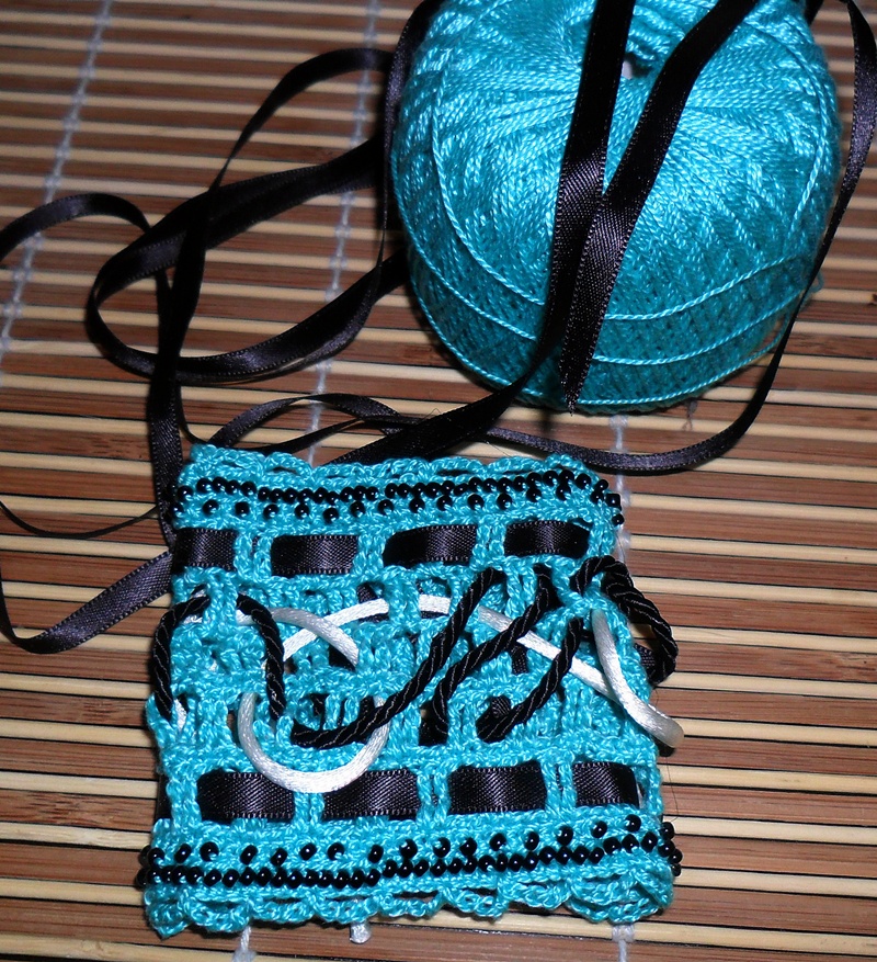 Esta realizada con ganchillo y se va realizando el diseño a medida que se avanza en el trabajo. Para crearla utilizamos hilo de algodón puro, rocallas negras, cinta blanca y cordón negro.