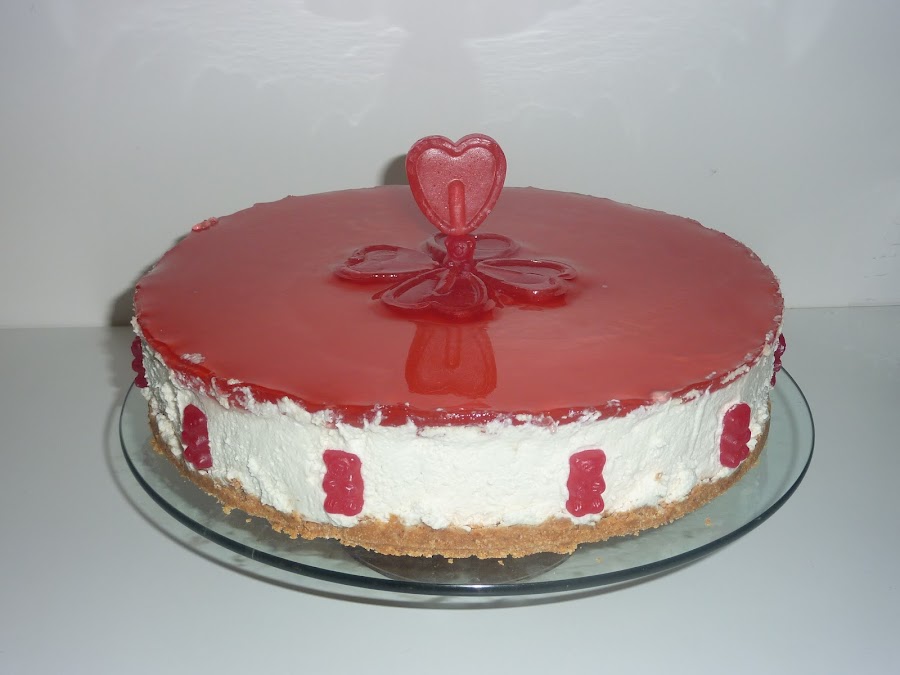 Una amiga que cocina de maravilla, ha creado recientemente un blog dedicado a la cocina y tiene unas recetas estupendas, a mi me gusto una en particular que es la tarta de caramelos de violeta, como se acercaba el cumpleaños de mi hija decidi hacerla, pero cambiando el caramelo por piruletas de sabor cereza, y la decore con piruletas y ositos de goma.