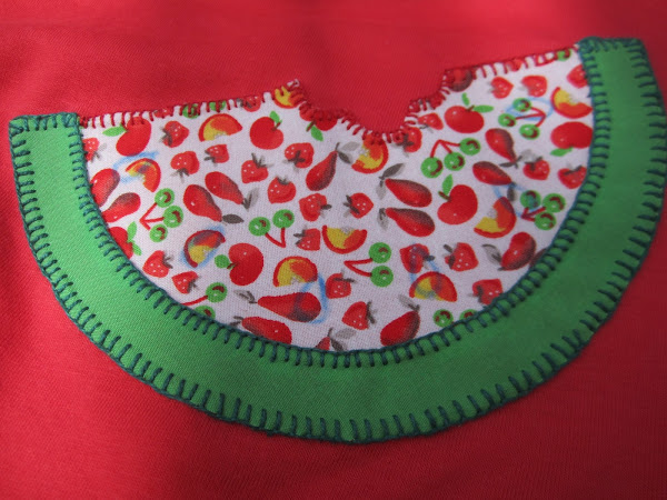Para esta ocasión he elegido un aplique de fruta? ¡¡claro!!... Una sandía, y además está realizada con un retal de la tela con frutas que me sobró de coser los ?Pinafore de Cosotela?.