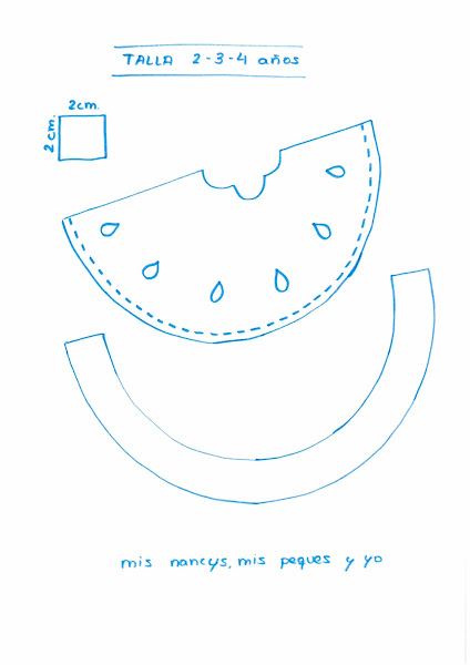 Aquí os dejo el patrón de la sandía en dos tamaños. Para camisetas talla 2, 3, o 4 años y para camisetas talla 5, 6 o 7 años.
