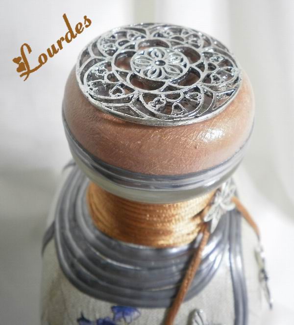 El cuello de la botella está decorado con cola de ratón y detalle metálico