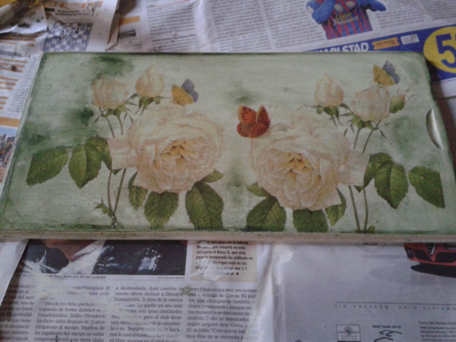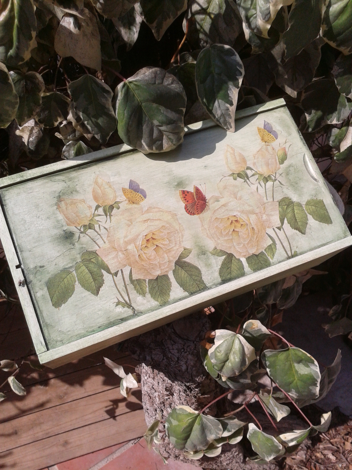 Primero la he pintado de color verde claro. Luego he pegado los recortes de servilleta y lo he barnizado. Le he dado pátina verde.