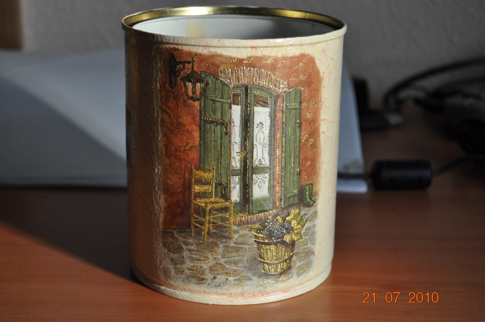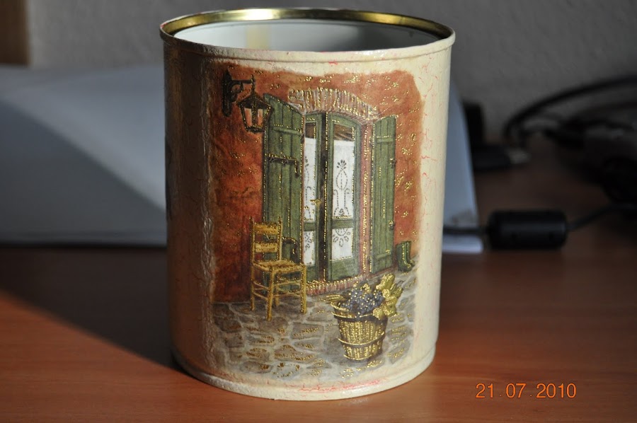 Este un reciclaje puro y duro de una lata de conservas, que craquelé y a la que añadí un motivo en decoupage, para poder utilizarla de portalápices.