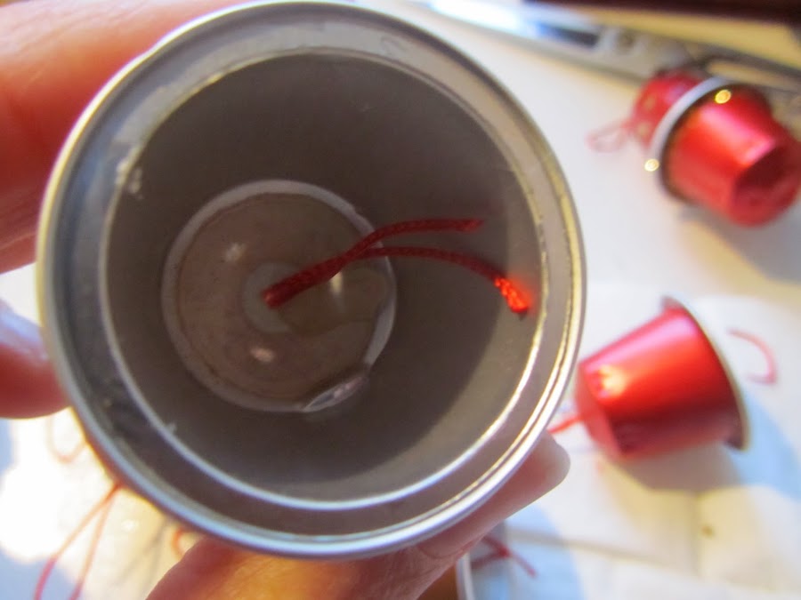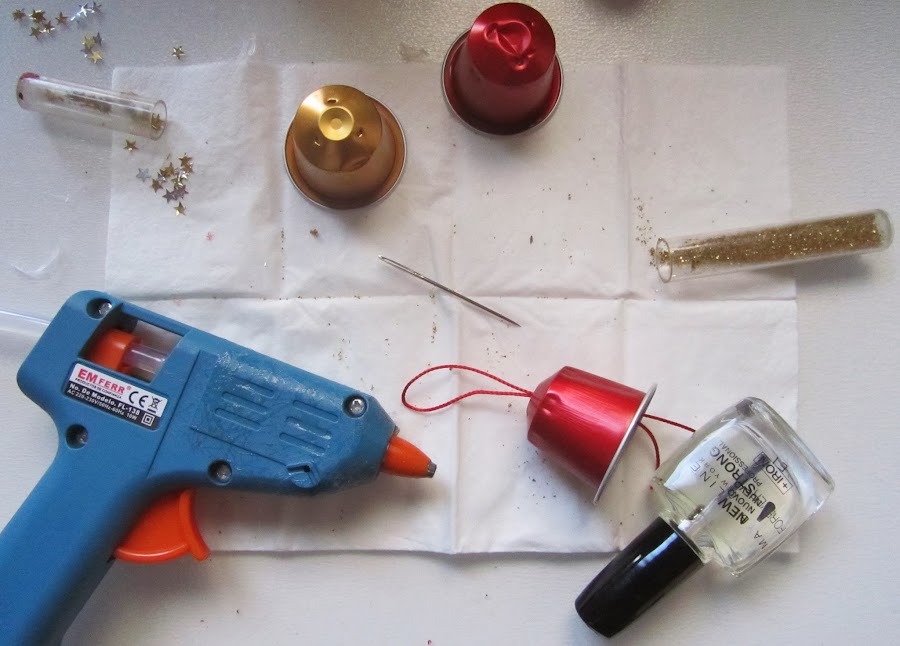 - Cápsulas Nespresso (rojas y doradas son las que he elegido yo, pero tú a tu gusto, si tu árbol es blanco creo que quedarían muy bien las verdes, y las negras le darían un toque muy sofisticado, no?, pero si es verde busca tonos que resalten)