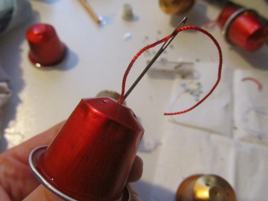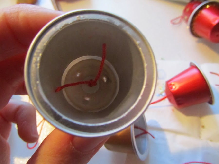 3-Enhebra la aguja con el trozo de cordel y pásala a través del agujerito que has hecho en la base de la cápsula. Vuelve a hacer el mismo recorrido en sentido contrario (pasa la aguja de nuevo por el agujero) de tal manera que te quede un trozo de cordel en forma de asa por encima de la cápsula.