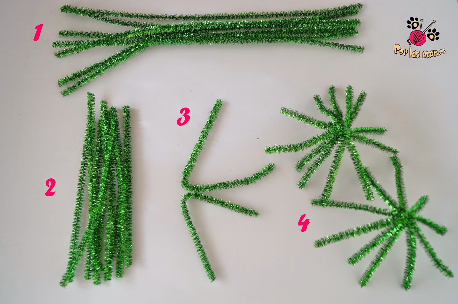 Cortamos los limpiapipas (1) por la mitad (2), y los vamos doblando a su vez por la mitad (3). Vamos uniendo los trozos de limpiapipas por el centro con silicona (porque creo que es la más fuerte). Y así vamos haciendo varias unidades, tal y como queda la imagen 4.