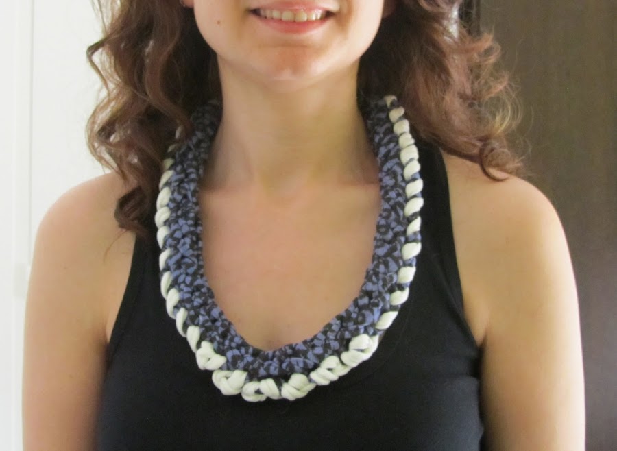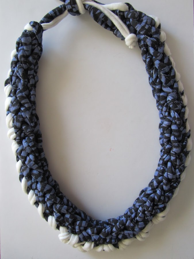 Esta vez os quería mostrar los collares y pulsera que hicimos el viernes pasado en un taller de dos horitas organizado por el Centro Cívico de Rubí (L"Ateneu). Están hechos con trapillo, seguramente habréis oído ya esta palabra, pero por si no es así, deciros que se trata de tiras de tela recicladas, con las que se pueden hacer variedad de cosas: bolsos, alfombras, cestas, pulseras,.. con un ganchillo XL.