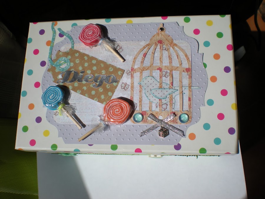 Estas son las tapaderas: tienen un papel de fondo embosado con efecto de dots realizado con una folder e mboss de la big, la forma del contorno del papel esta cortado con un troquel de la big, sobre puesto a este va una lámina de papel con los cantos redodeados, el tag , así como la jaula y el pajarito están elaborados con troqueles de la big, las piruletas las realice con fieltro de colores os dejo el post del tuto que las hice en agosto, el nombre esta recortado con la craft en cartulina efecto espejo, los pebbles son caseros con papel de scrap en tono azul y pegado con glossy acent, un lacito al que va cosido un charm de plata cuyo motivo es el típico cubo infantil con un ABC, la jaula en la parte superior esta rematada por un brad metálico plateado .