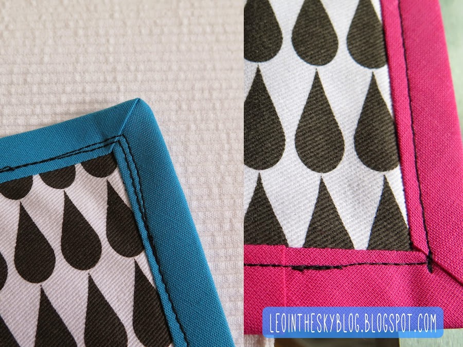 Se coloca la cinta bies con unos alfileres y se cose a máquina. Para hacer las esquinas miré tutoriales en internet para saber cómo coser correctamente esta cinta, que yo antes cosía a las bravas y ya aprendí que no, que primero se cose un lado y luego se hace el otro tapando la costura del lado anterior...