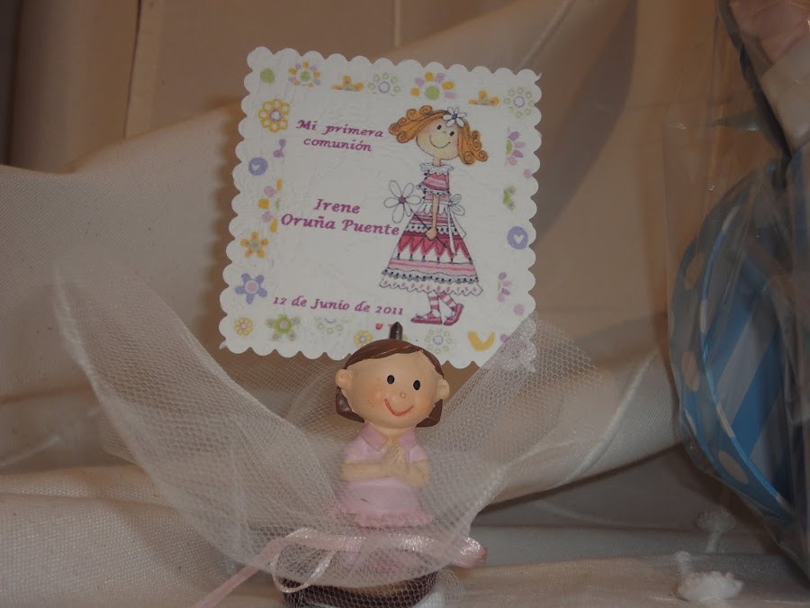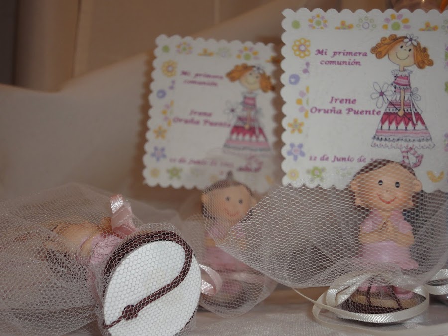 Las medallitas se las metí entre tul blanco, y lo adorné con unas figuras de comunión que compré, quedó muy gracioso.