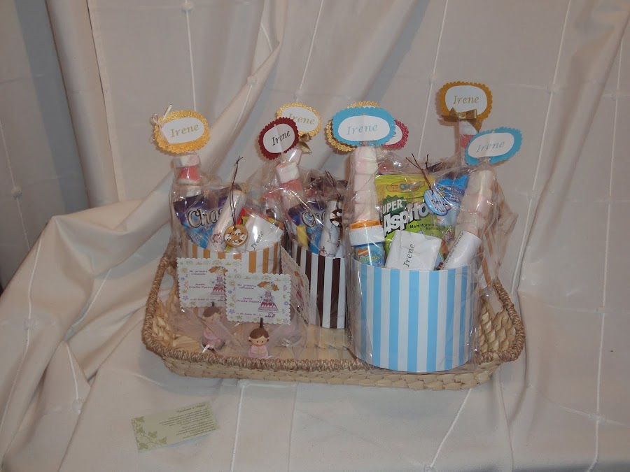 Estas son las chuches...presentadas en cajas de cartón, adornadas con lacitos, brochetas personalizadas incluidas, cada una del mismo color que la caja, con detalles como lazos o papel de relieve.