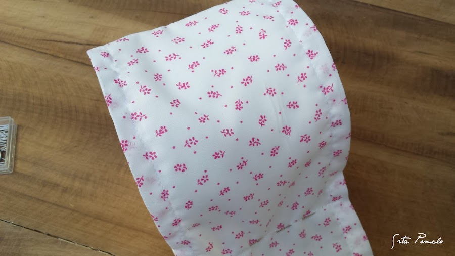 Una vez cosidos los bordes, unimos los dos rectángulos de tela (tela estampada y tela lisa) y después colocamos un rollo de papel higiénico entre ambos para tomarle las medidas. Estas medidas dependerán del tipo de papel higiénico que compréis (algunos vienen más gorditos y otros más delgaditos). Al tomar la medida, envolvemos el rollo y unimos las dos telas con alfileres para después coserlas por ahí.