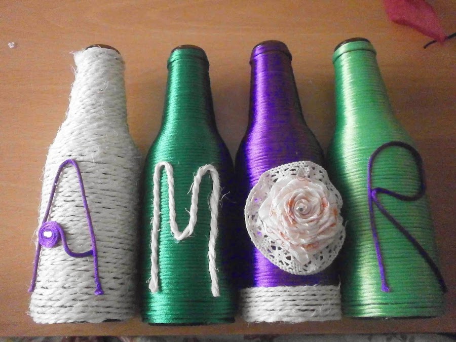 Con las mismas cuerdas escribí una letra a cada botella formando una palabra. La flor de la botella lila la hice con lazo y puntilla.