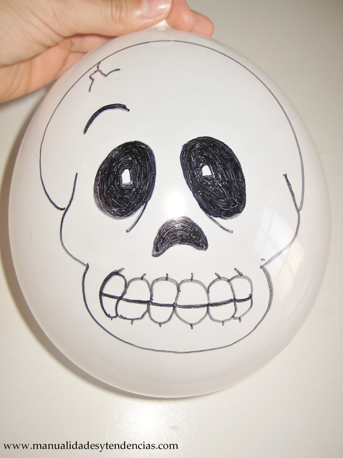 Para hacer esta "guirnalda terrorífica" sólo necesitaréis globos blancos, cuerda y un rotulador negro. Dibujaremos caras de monstruos y calaveras, yo os dejo unos ejemplos facilitos pensados para que cualquier niño pueda realizarlos. Ahora sólo queda atar los globos con una cuerda y ¡listo para colgar!