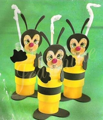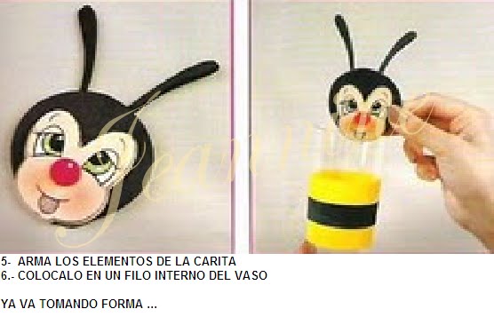 Cortar en cartulina (papel) de color o foamy, el cuerpo del insecto y pegar en ambas caras de la bolsa.