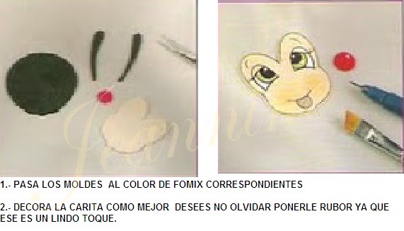 2. Pega el foami termoformado sobre foami plano del mismo color y rellena antes de cerrar. Para la cara, matiza las chapitas con gis y pinta los ojos con las pinturas acrílicas. Pega el pompón en el centro de la cara para simular la nariz.