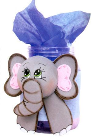Dibuja las pezuñas y rellena con la pintura blanca. Pega la trompa a la cabeza y pega por detrás las orejas y las patas. Forra con la tela azul el centro del bote y pega la figura al centro