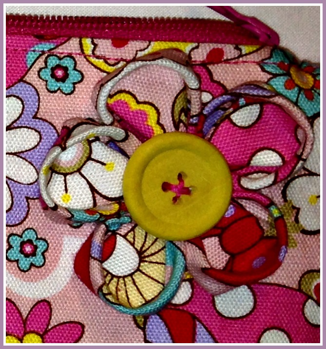 Como adorno he hecho una flor Kanzashi para adornarlo siguiendo este tutorial. La he hecho con cinco cuadraditos de la misma tela de 5 x 5 cm. En medio he cosido un botón de madera pintado en amarillo y he cosido la flor al estuche, reforzándola con silicona líquida.