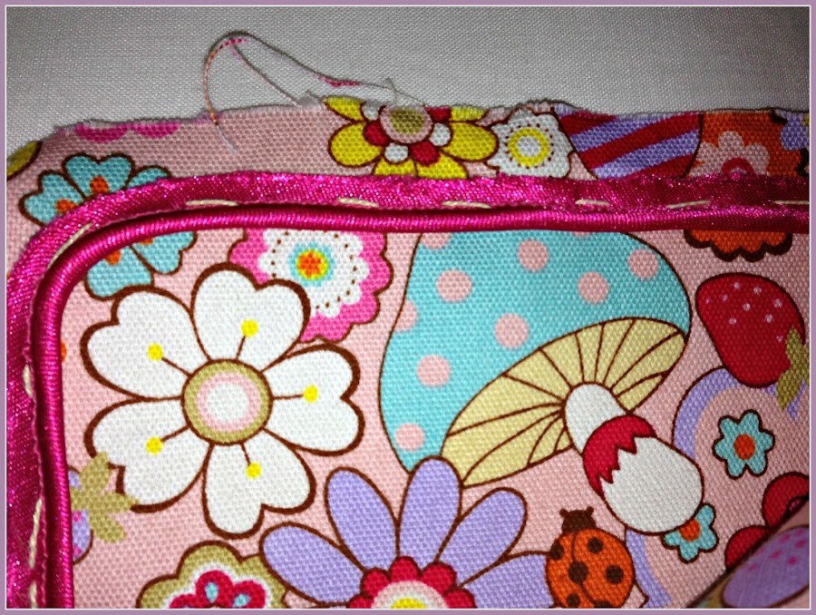 Yo quería hacer un estuche con un vivo en color rosa. Como no tenía ninguno y mi hija quería el estuche para "inmediatamismo" he hecho yo el vivo (vivo, por si alguien no lo sabe, son las cintas con cordoncillo o alambre en su interior que se utilizan para adornar costuras). He cortado por la mitad, longitudinalmente, una cinta rosa de bies; la he planchado y después he puesto en su interior un cordel rosa que utilizo para manualidades. Lo he cosido y ya está hecho el vivo. Ha quedado muy bien, la verdad.