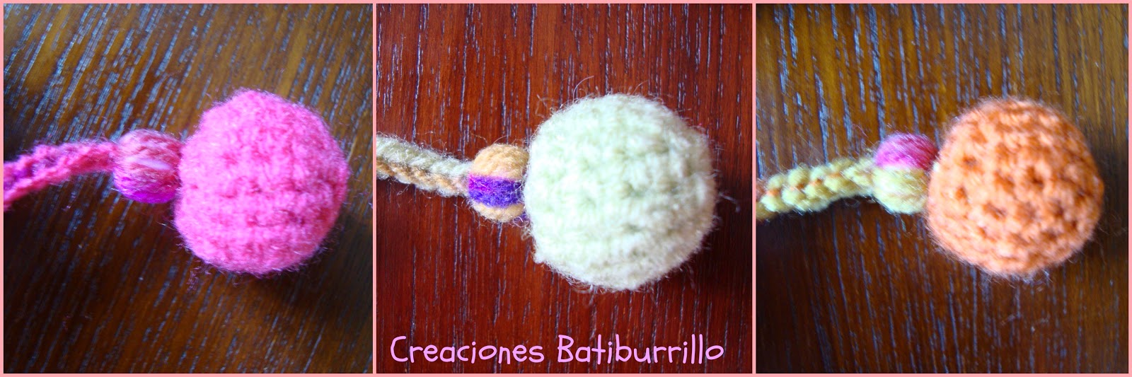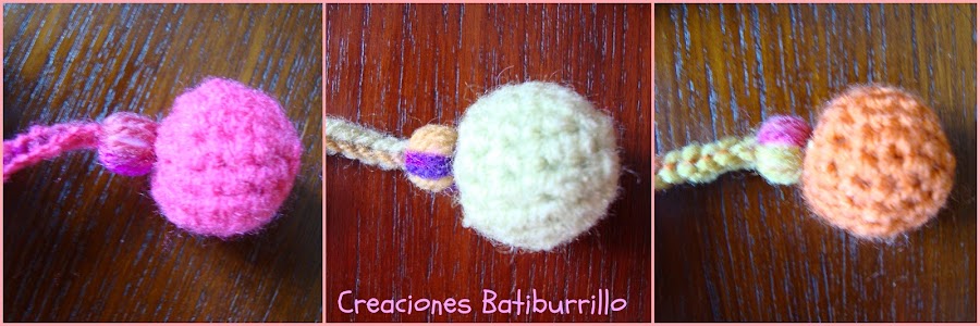 Y por último la ESFERA, siguiendo el mismo patrón que he repetido en otras ocasiones cuando cubría abalorios, pero en esta ocasión relleno de fibra y con un tamaño bien pequeño.