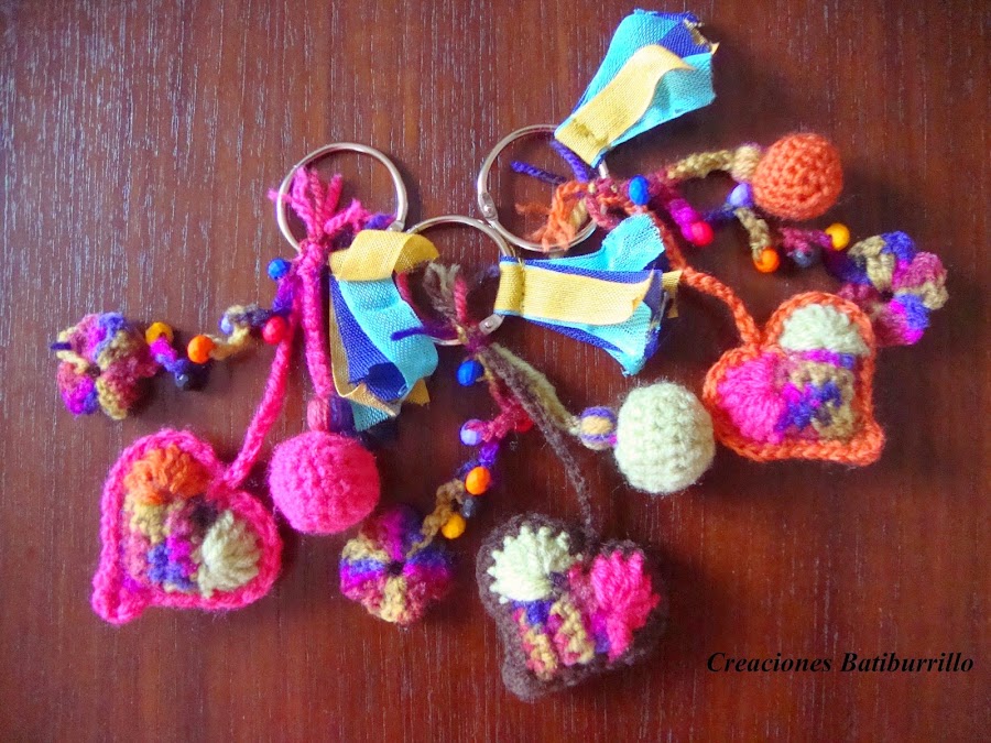 Todo ello va unido con flecos a una arandela con abre-cierra fácil para poder usarlo como llavero o llevarlo colgando, poniendo color donde más nos guste.