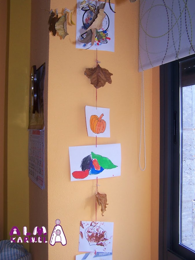 Tras dejar que se secaran, algunos los recorté un poco, cogimos una lana y los colocamos todos, así como unas cuantas hojas que cogió María el viernes de vuelta a casa desde el cole, porque las quería poner en el salón. Las pusimos en dos tiras y las colocamos en la pared, junto a la otra guirnalda que ya teníamos puesta de hojas hechas en fieltro y las recogidas de los árboles.