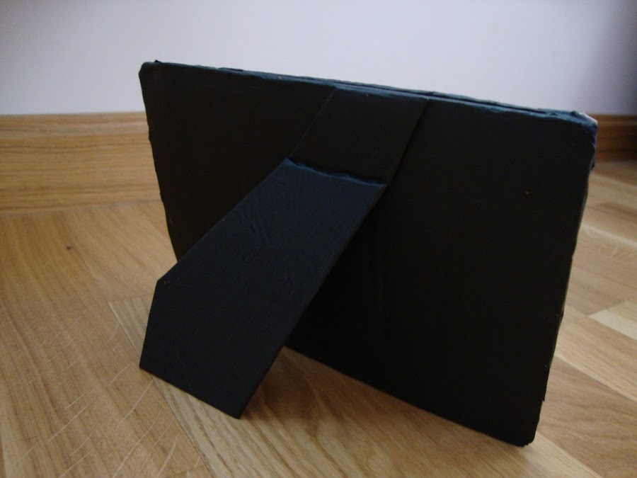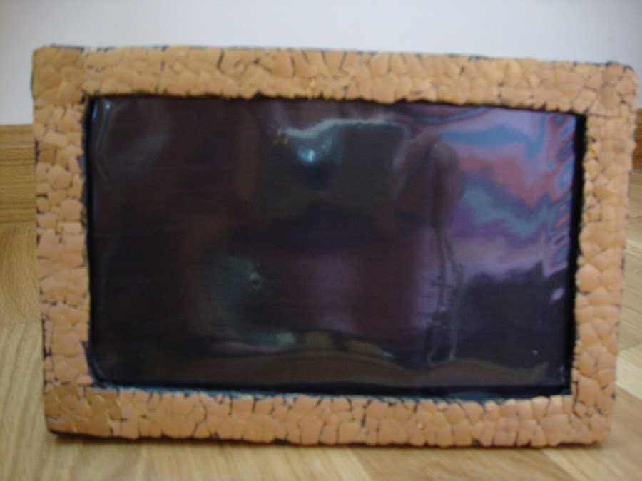 La base es de cartón. Hice un rectángulo para la parte de atrás y otro para adelante dejando el hueco necesario para la foto. También un soporte para la parte de atrás como muestro en la foto al que después se le hace un pequeño doblez.