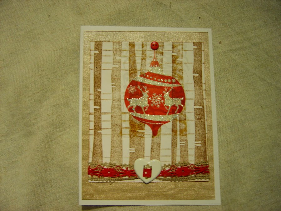 Esta tiene una característica muy particular, ya veréis, esta realizada con cartulina de base blanca, cartulina texturizada dorada, una cinta crema y roja de puntilla, un brad pasacintas en forma de corazón, un gran sello de fondo recreando un bosque, entintado con Distress vintage, un botoncito rojo y aquí tenemos la característica particular, la bola de navidad no es un troquel, ni un sello, no, no, es una pegatina de cristal, si de esas que la pones y la quitas de la ventana para adornarla, pues eso, jajaja, chicas hay que reciclar y realizar cosas con materiales que tenemos a mano, ¿que os parece el resultado? a mi me gusta mucho.