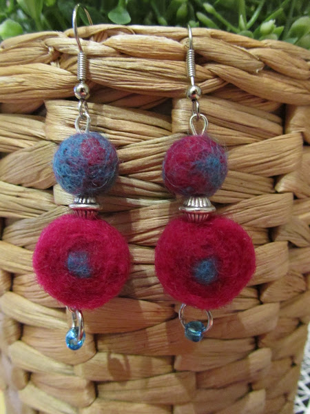 Estos están hechos con trocitos de filetro plano de colores y con lana de fieltrar. Ya os hice referencia en otro post dónde podías mirar cómo hacer las bolas con fieltro: http://fieltruna.blogspot.com.es/2013/03/pendientes-con-fieltro.html