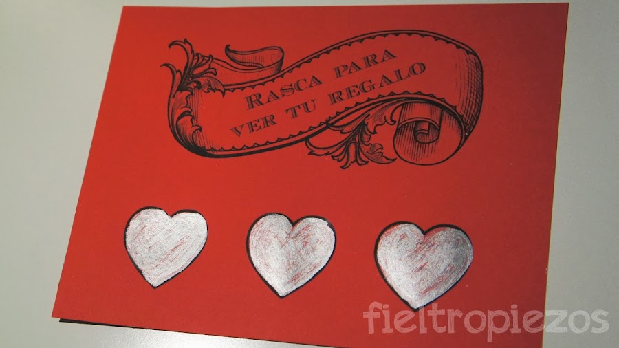 Así que eso es todo: Crea un diseño (o imprime el que yo os he propuesto), aplica el plastidecor blanco sobre la zona a rascar, y para finalizar, dale una buena capa de pintura metalizada. Déjalo secar y listo! Ya puedes dárselo a tu pareja para que pruebe suerte y a ver qué regalazo se lleva!!