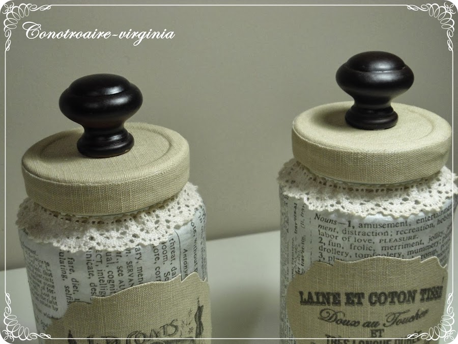 Los tarros los he forrado con papel, es un papel muy finito pero muy resistente y se pega muy bien, y queda un poco transparenta, parecido al papel de arroz.
