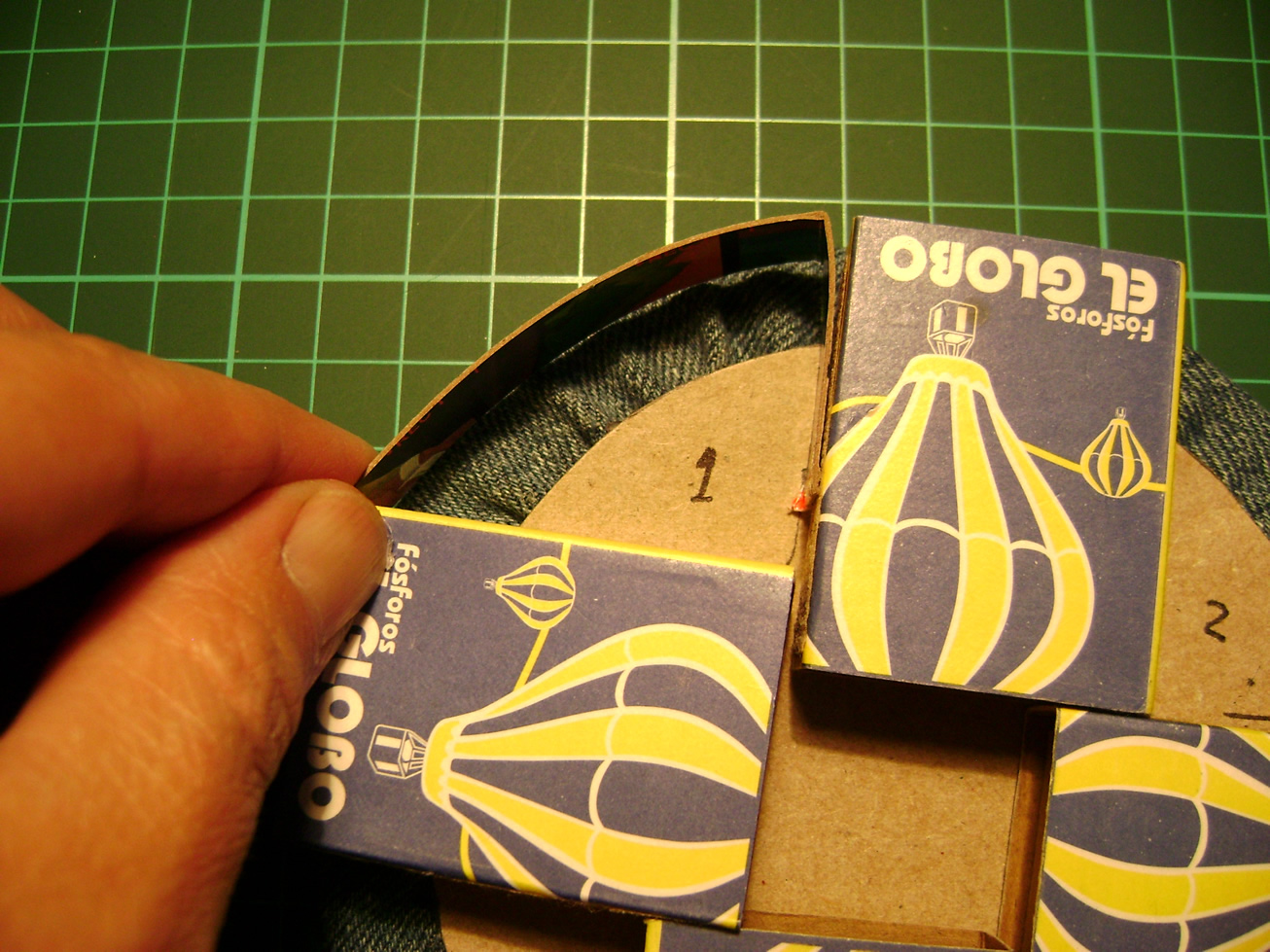 A uno de los círculos se le pega con silicona caliente uno de los cartones y luego las 4 cajas de fósforos. Debo confesar que me quedaron muy al ras.